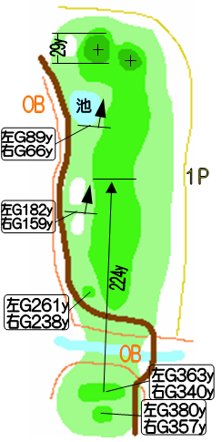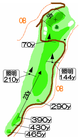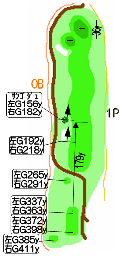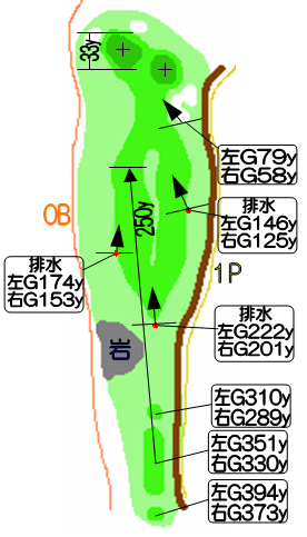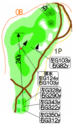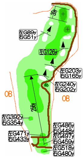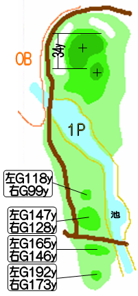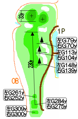 ティーショットは右ねらい、セカンドは1クラブおおきめに。